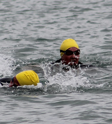 There I am waiting to start, with my feet getting used to the water. I should have got the rest of me used to the cold water too, it was a hell of a shock to the system when I did plunge in.